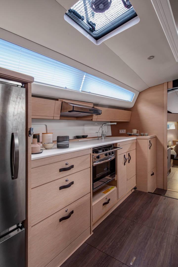 A yacht with majestic lines, designed to cut through the waves and to travel the world, the Jeanneau Yachts 54, in keeping with the spirit of the line, features exterior living spaces designed to enable you to freely enjoy all the pleasures of life on the water. The dedicated space for the helmsman and for handling all controls is located in the aft cockpit: the helm, the engine, the bow thruster, the sheets of the mainsail and genoa… leaving the space clear for the generous cockpit dining area, surrounded by living areas dedicated for relaxation: sun loungers located to either side of the companionway, and at anchor, a recessed sundeck on the forward deck, and two more on the swim platform.