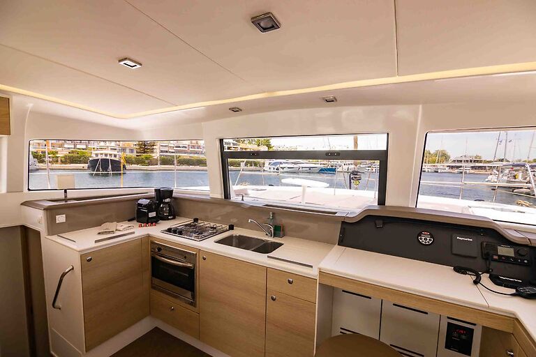 The vast cockpit and saloon area is a unique feature of this impressive new Bali catamaran range which completely opens up with a huge pivoting glazed door combining the indoor and outdoor space for optimum enjoyment of the beautiful Mediterranean weather.