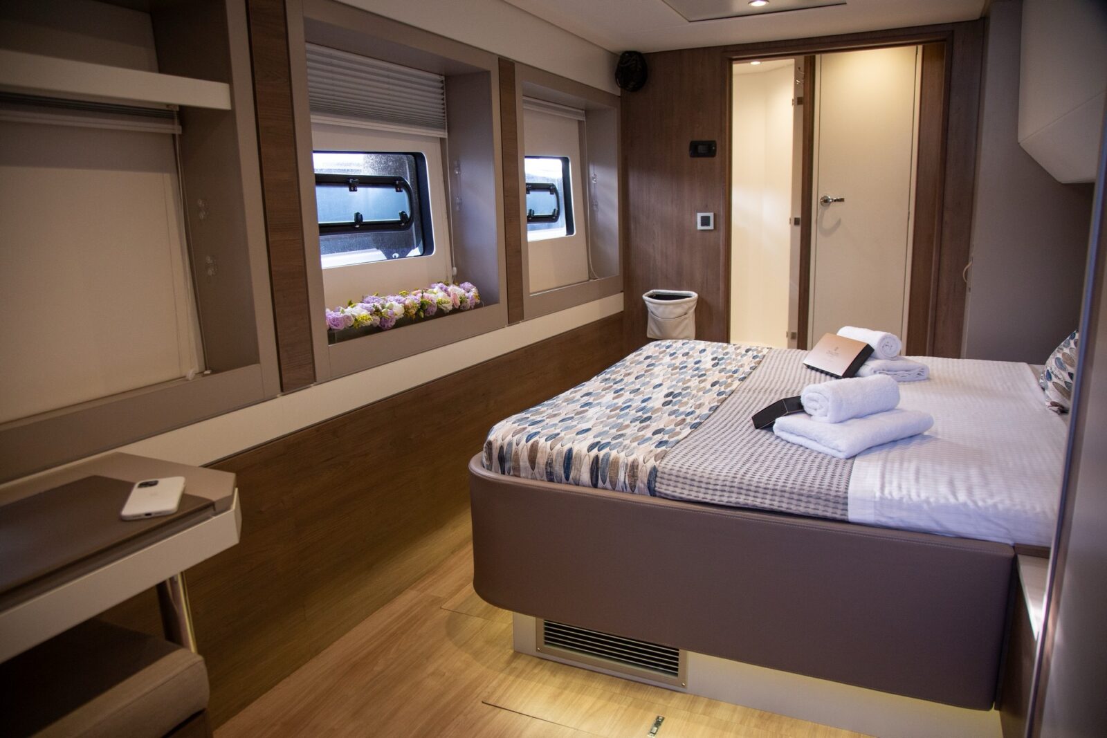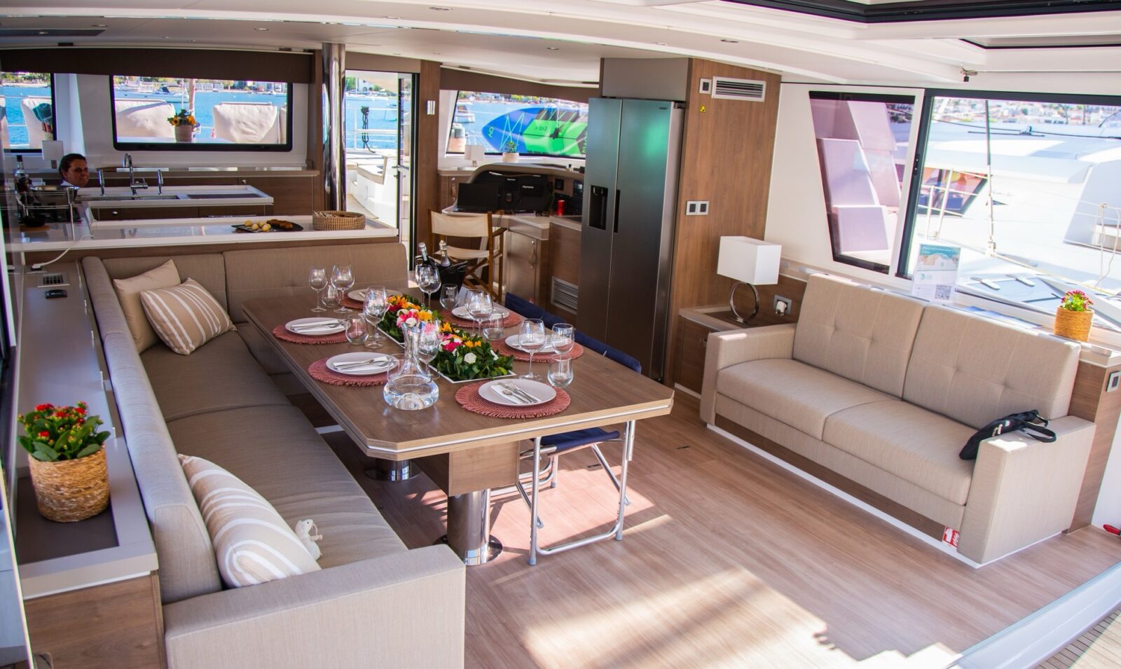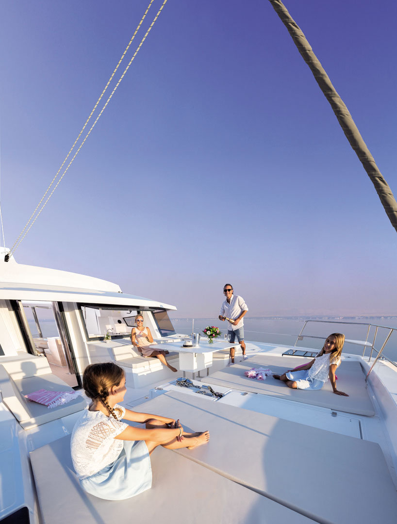 The Bali 5.4 has a huge lounge area for sunbathing at the forward cockpit with sunbathing tent for warmer days. The expansive dining area can be opened or closed thanks to the amazing Bali tilting door which opens up bringing the inside and outside as one phenomenal space. Comfortable seating, sofas and sunbathing areas inside and out, and a huge refrigerator with an ice maker. With an immense master cabin, with dressing table/work bench plus 3 further spacious doubles offering stunning sea views plus a cabin with 2 single beds offers flexible, comfortable accommodation.