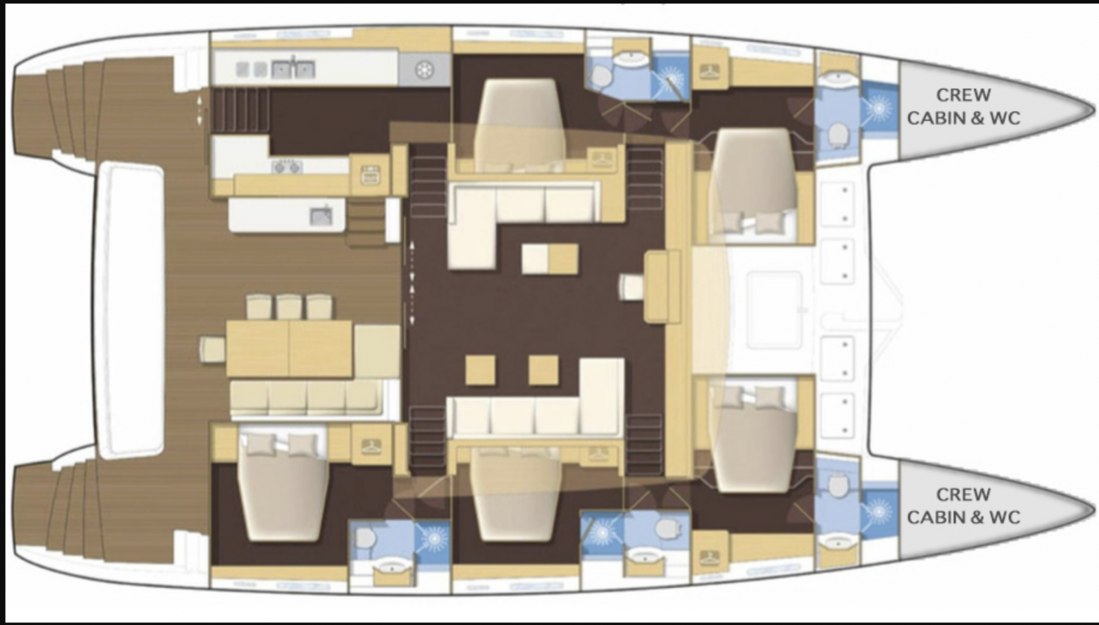 Accommodation: One master cabin (Bed size 1,80 x 2,00 m) and four queen bed guest cabins (bed sizes 1,60 m x 2,00 m) all with private facilities