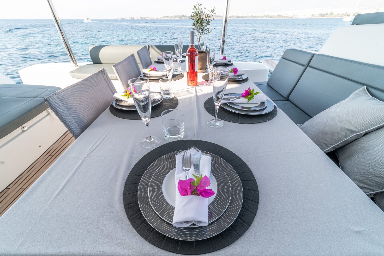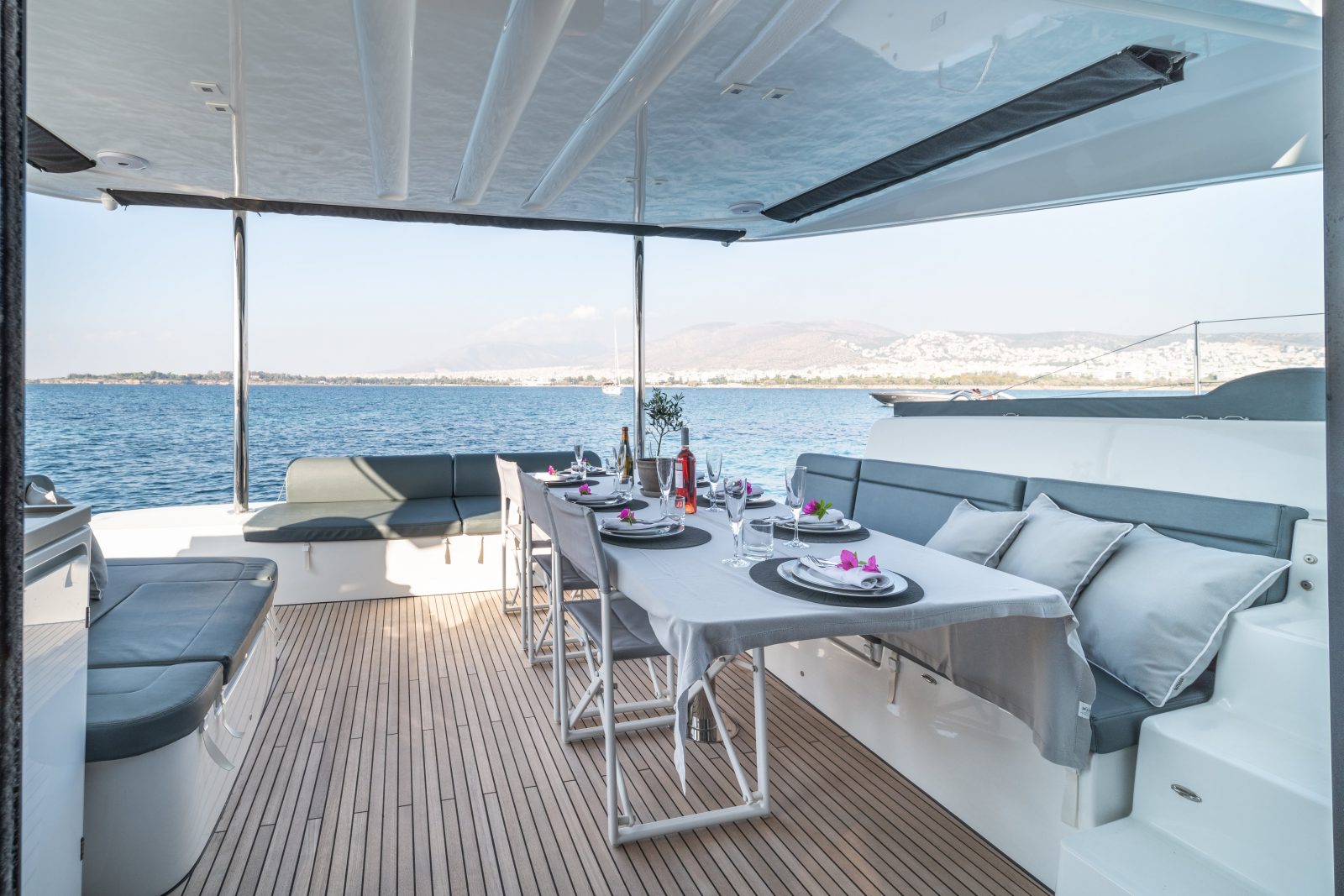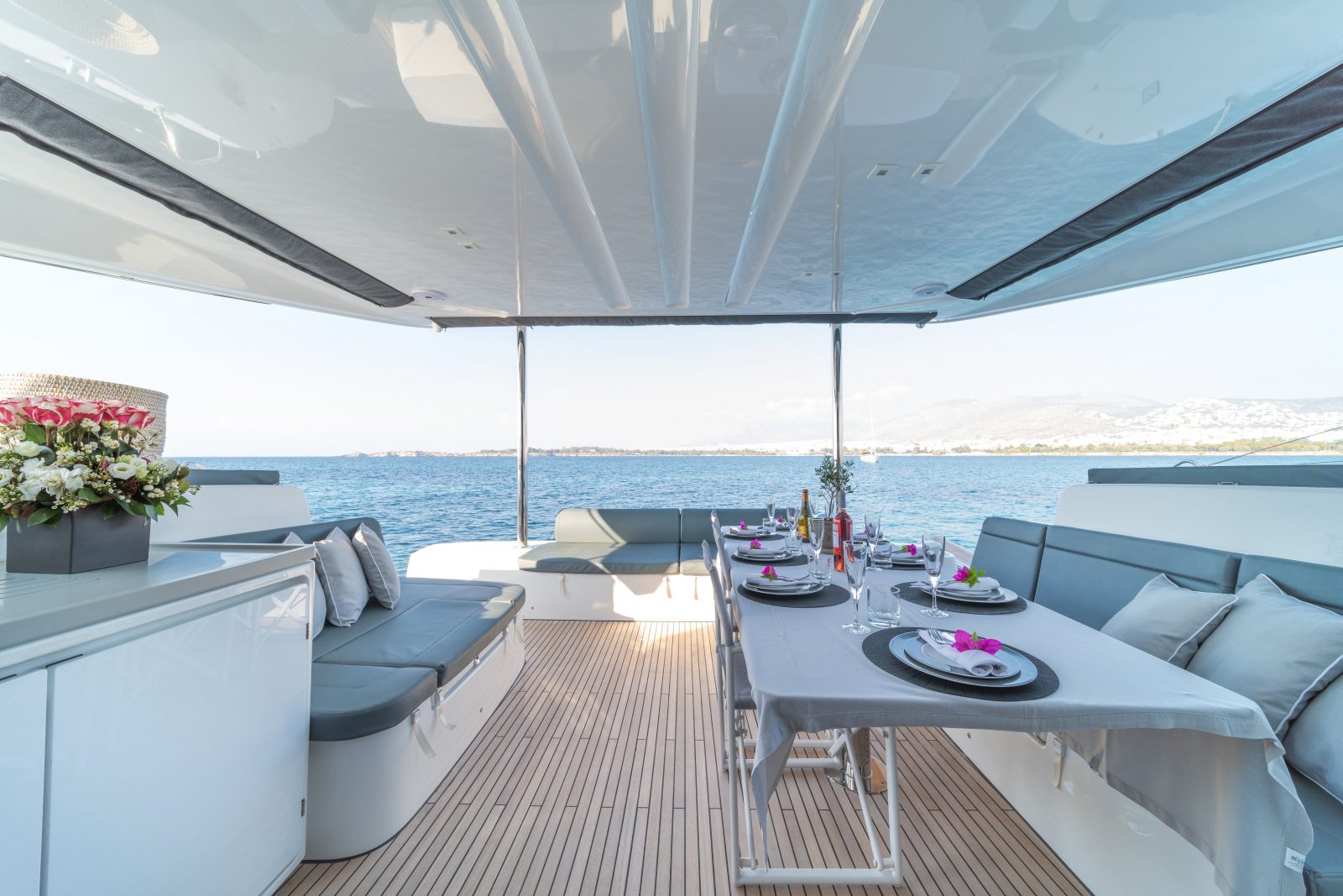 Features: Excellent crew, Large deck area, fly bridge, hydraulic swimming platform.