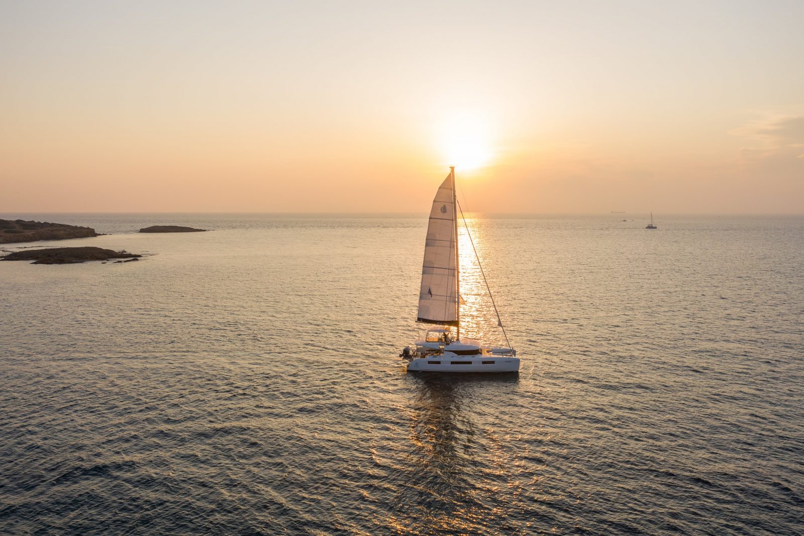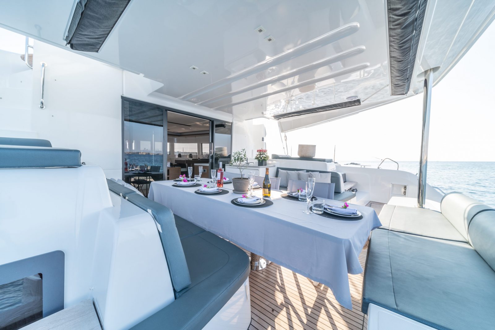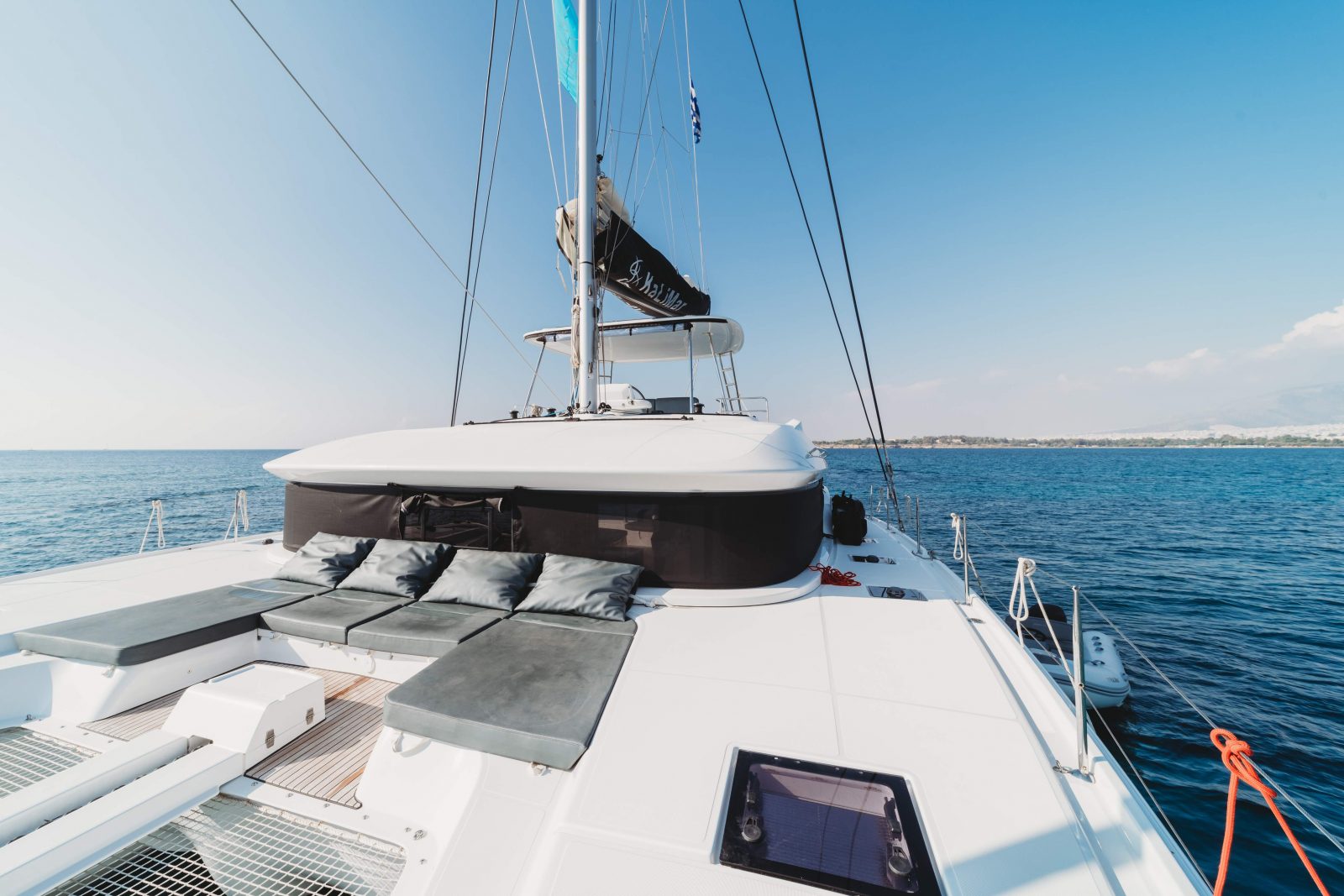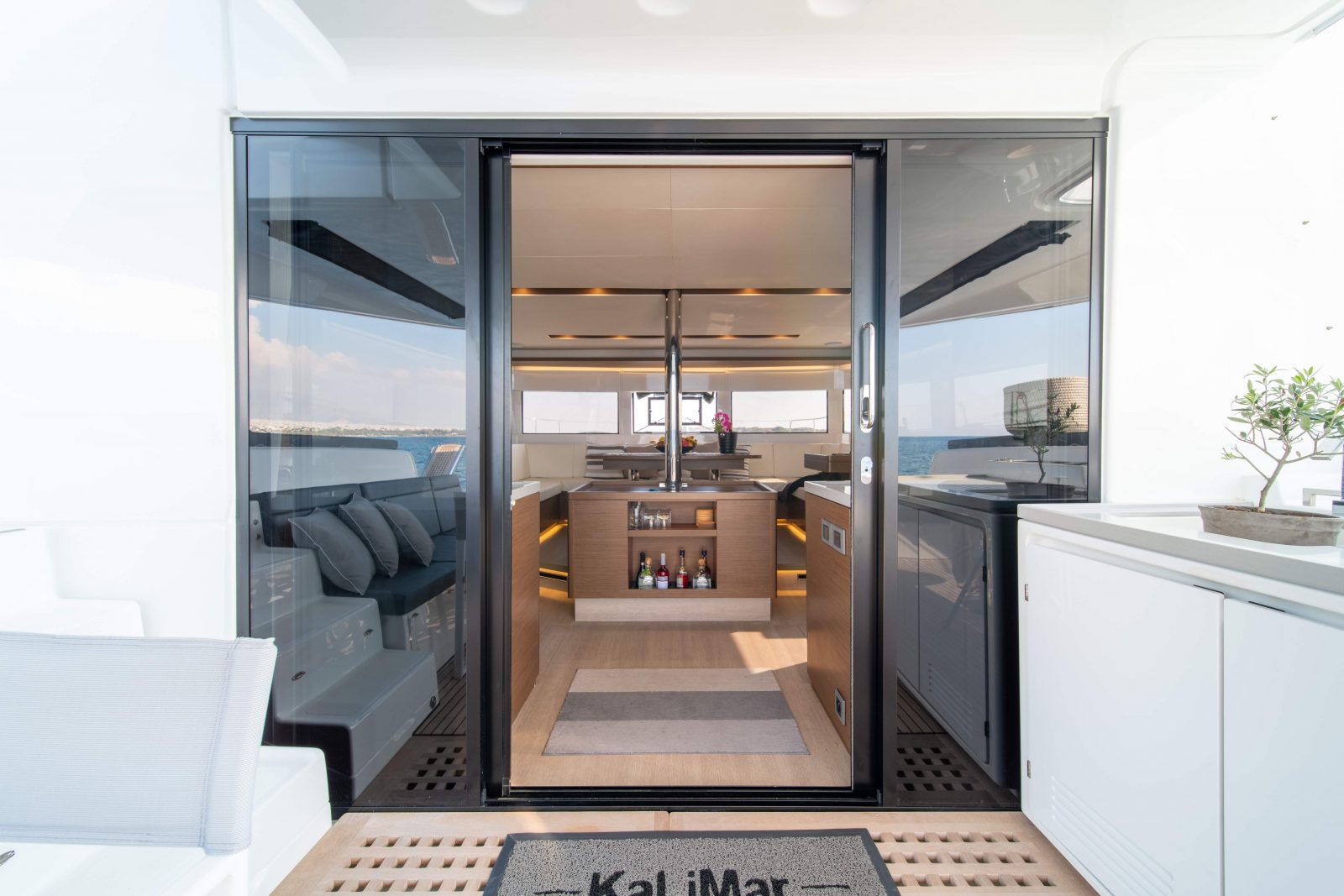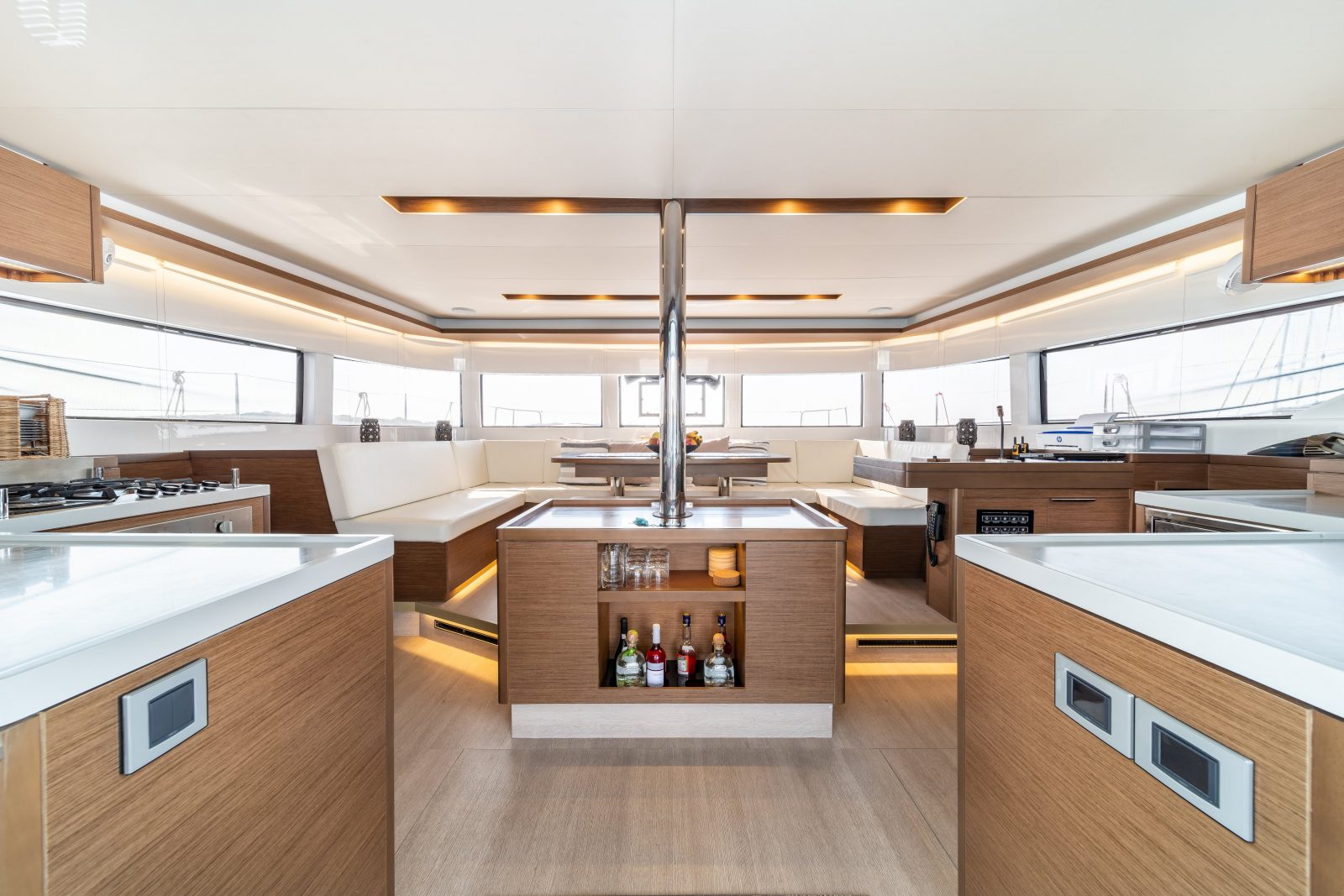 KaLiMar, the spaciously designed layout of Lagoon 50 reveals innovative architecture where every detail has been planned to create a warm, homely atmosphere. With her new visual identity and hull design, she provides increased performance, she is elegant with generous space above and below decks and panoramic views. A large open cockpit facing out to sea, large stern skirts enable easy access to the boat and a large modular dining area with removable bench seats to welcome children and adults alike. A second cockpit for further enjoyment of the foredeck with dual function: seating or deck chair position, flush with the forward trampoline.