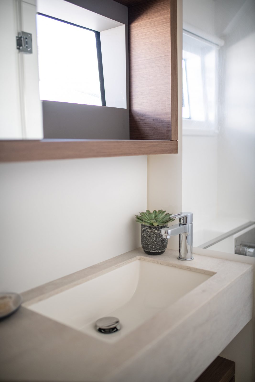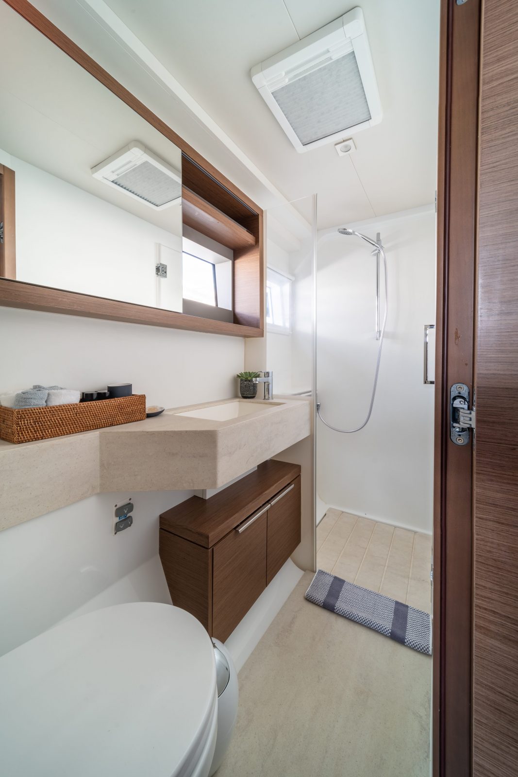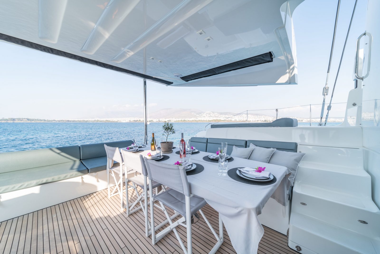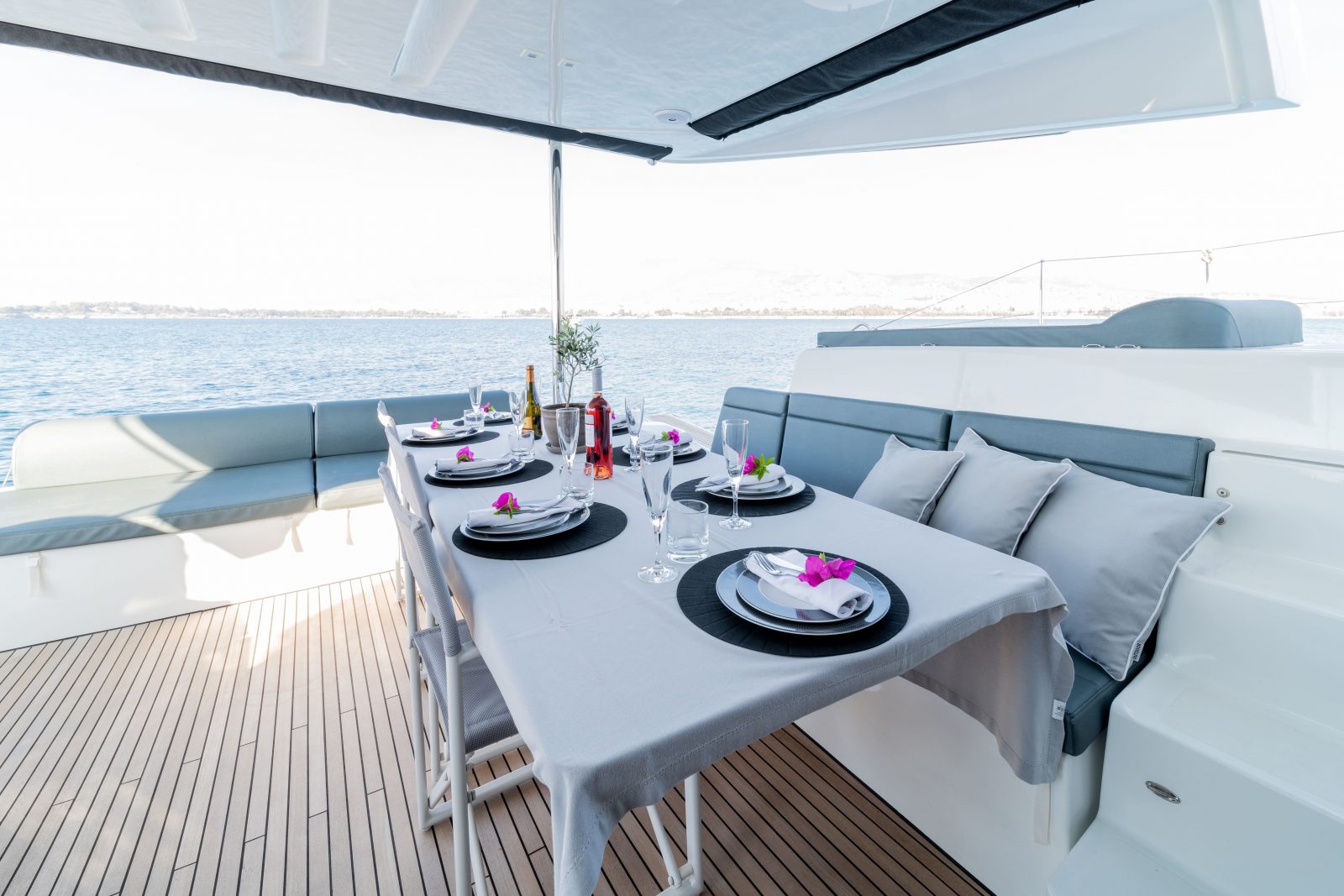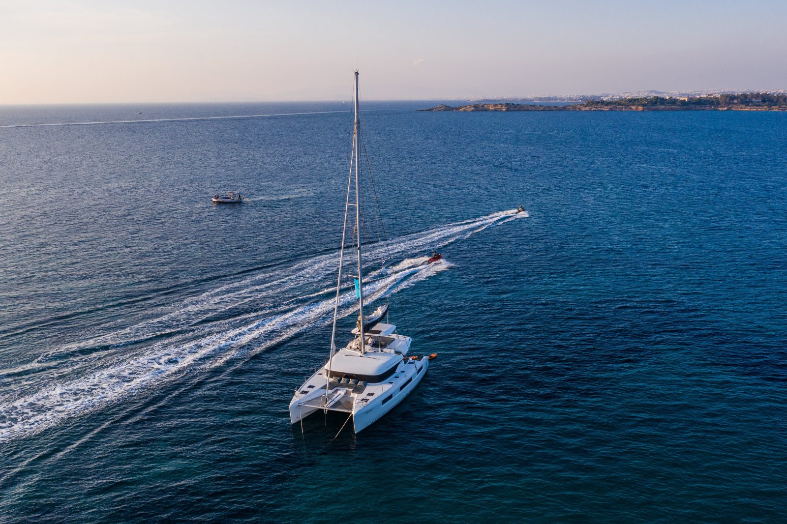 KaLiMar, the spaciously designed layout of Lagoon 50 reveals innovative architecture where every detail has been planned to create a warm, homely atmosphere. With her new visual identity and hull design, she provides increased performance, she is elegant with generous space above and below decks and panoramic views. A large open cockpit facing out to sea, large stern skirts enable easy access to the boat and a large modular dining area with removable bench seats to welcome children and adults alike. A second cockpit for further enjoyment of the foredeck with dual function: seating or deck chair position, flush with the forward trampoline.