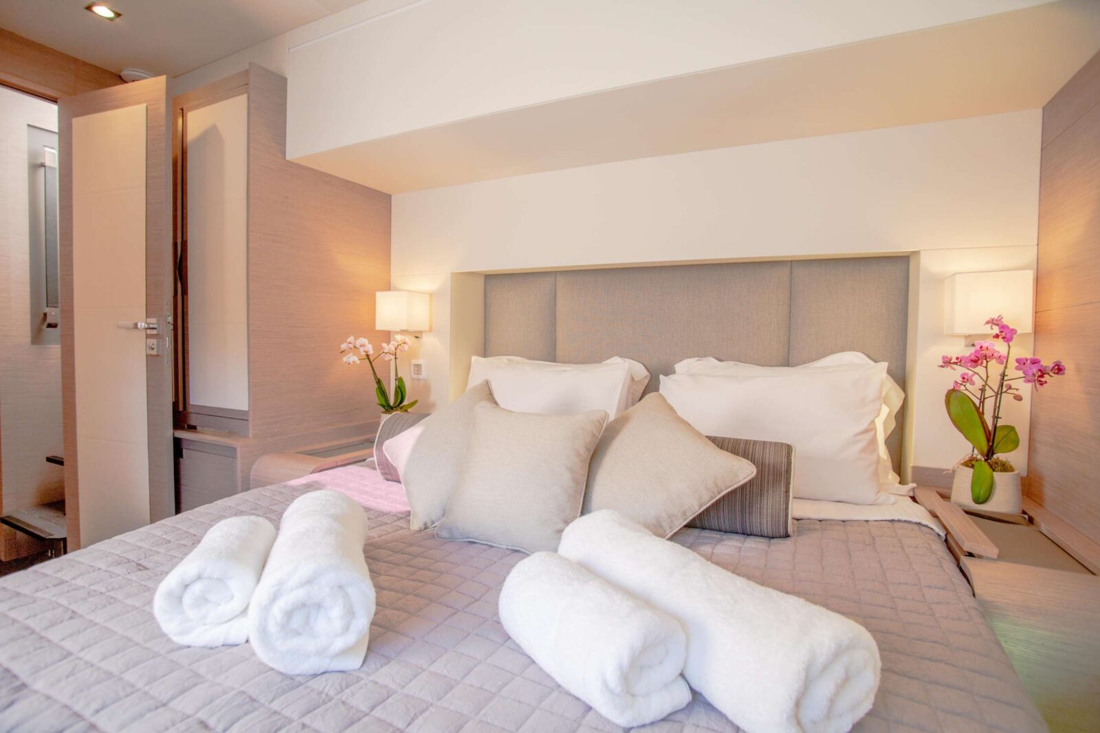 S/Y DOLLY is the ultimate example of luxury in a catamaran, with an expansive flybridge with an authentic ocean terrace and a forward cockpit with ample seating. Enjoy the thrill of sailing or simply unwind on the decadent lounges and sunbathing beds. Her interior is strikingly modern and incredibly spacious, providing the ultimate in comfort and luxury. She accommodates 10 guests in five cabins, including one owner’s suite and four queen-sized cabins with private bathrooms and galley up.